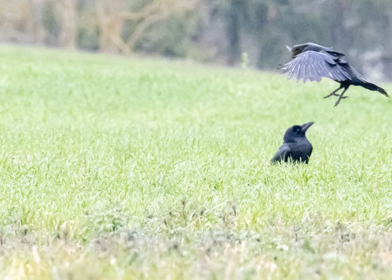 Das sieht sogar fast wie eine „Kolkraben-Verlobung“ aus Anfang April. Der Winter scheint noch einmal zuzuschlagen. Heftige, kurze Schneeschauer. Ein eiskalter, böiger Wind streicht...